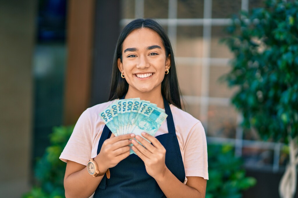 Mulher com dinheiro na mão representando onde investir 20 mil